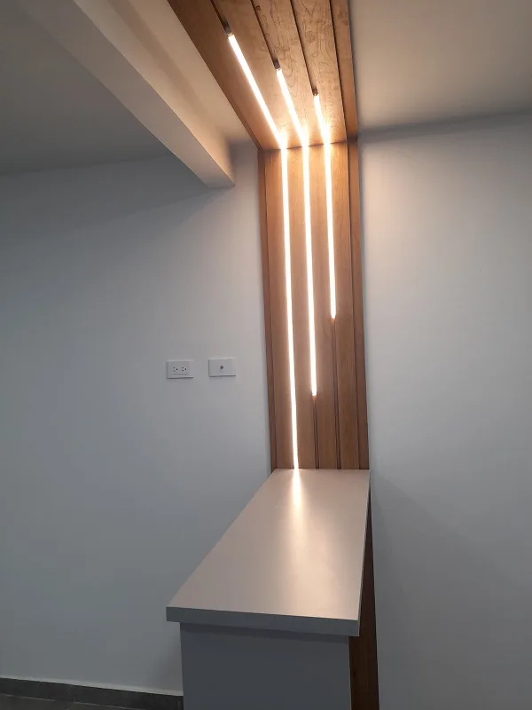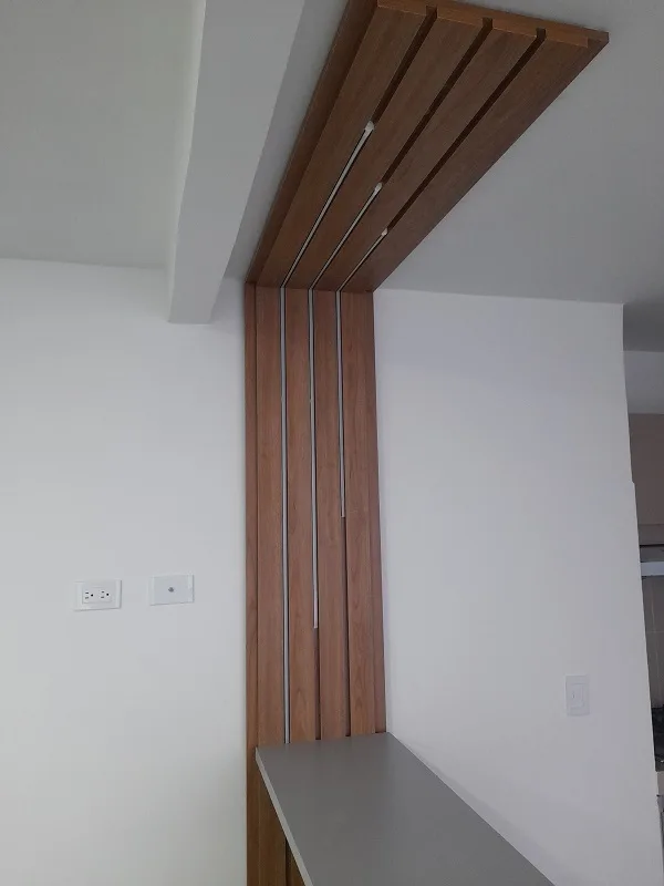 El inmueble se desarrolla en segundo piso y cuenta con amplios espacios interiores. Al ingresar, encontramos una sala-comedor integrada con ventanales que permiten una ventilación cruzada constante y entrada de luz natural durante todo el día. La cocina integral es de concepto abierto, equipada con estufa, campana extractora y barra americana con acabado tipo madera alistonada, aportando un estilo contemporáneo.